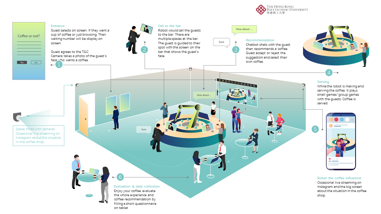 a screen; (ii) recommending a type of coffee after chatting with the guest; and (iii) notifying the